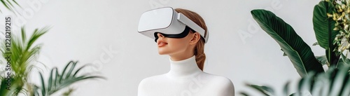 Woman wearing VR headset, exploring a virtual world. Minimalist, modern aesthetic.