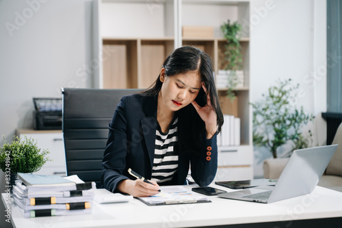 Woman who is tired and overthinking from working with tablet and laptop at modern office..