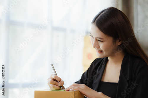 Woman who runs an e-commerce business is writing a list of customers on paper before shipping to them, she runs an e-commerce business on websites and social media. Concept of selling products online.