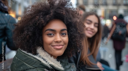 Woman with an afro relaxing with friends on a bench, smiling, and enjoying their time together