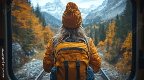 Woman with Backpack Enjoys Autumn Mountain View From Train Window