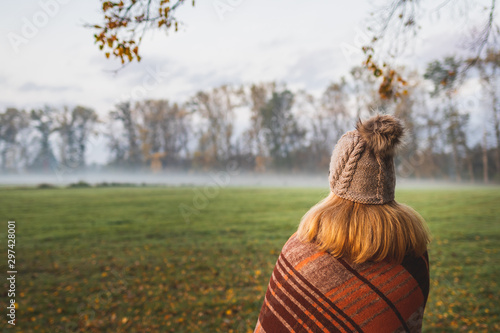 Woman with blanket and knit hat enjoying cold misty morning outdoors