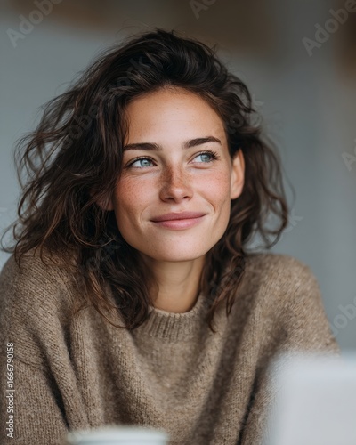 Woman with brown hair and blue eyes is smiling