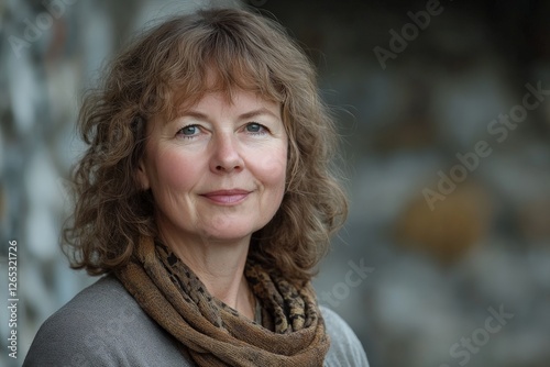 Woman with curly hair and scarf poses in natural light against a textured background in a serene setting