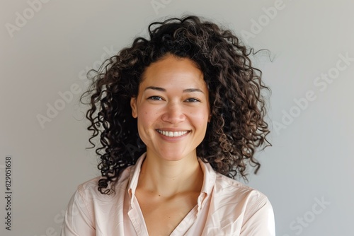 woman with curly hair smiling, wearing a light pink shirt, light grey background.