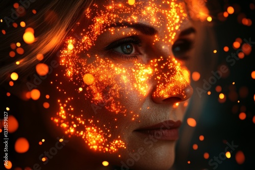 Woman with glowing particles illuminating her face in a dark setting during an artistic expression event