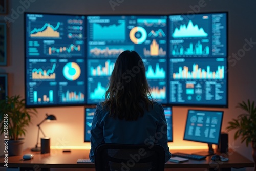 woman with long brown hair sitting at a desk working in front of a large computer screen displaying data visualizations The room is dimly lit