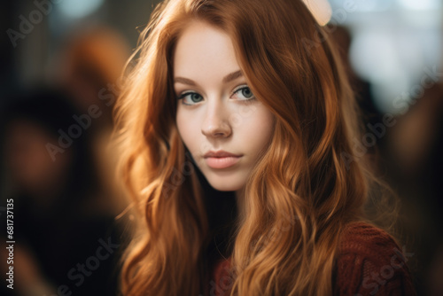 Woman with long red hair is looking directly at camera. This image can be used to convey confidence, beauty, or individuality. It is suitable for various projects and purposes