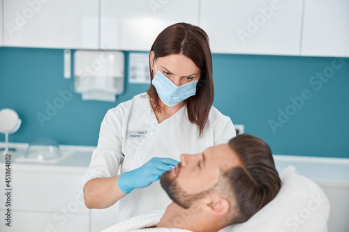 Woman with mask does injection to middle aged man at nasolabial fold filler procedure in clinic