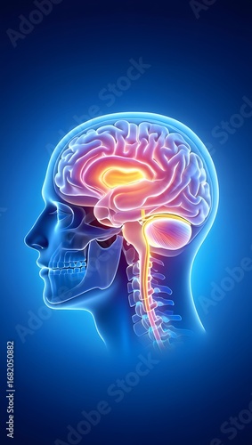 Woman with optic nerve and link to stimulated brain region - X ray style 3D illustration with blue background