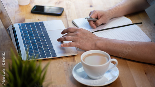 Woman working from home with laptop, notepad, and smartphone. Close up, shallow depth of field.