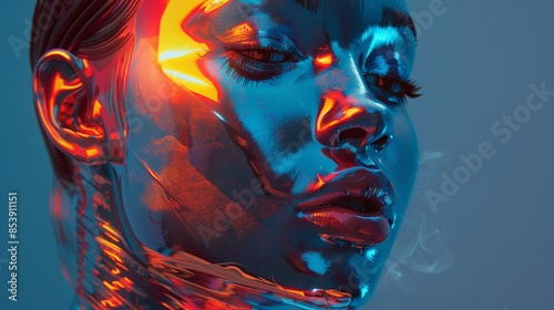 Womans Face Illuminated With Vibrant Red and Blue Lighting