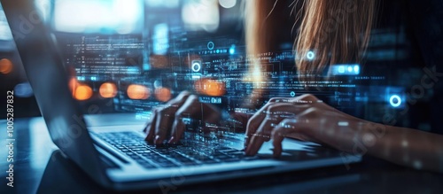 Woman's hands typing on a laptop keyboard with digital code and data surrounding her.