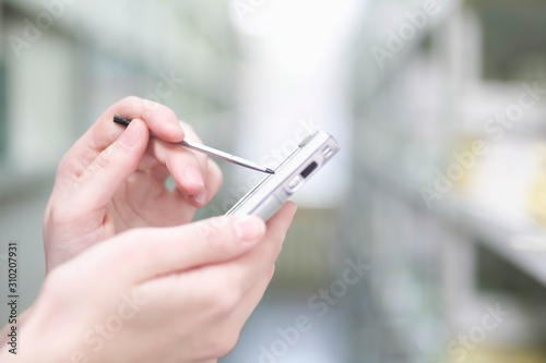 Woman's Hands Using PDA In Library