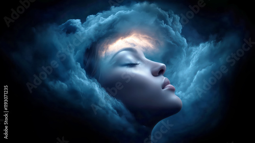 Woman's head in the clouds. Dream , imagination, mental health concept.