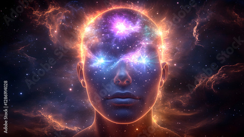 Womans head silhouette with a colorful nebula background and tulip flowers in a surreal cosmic landscape