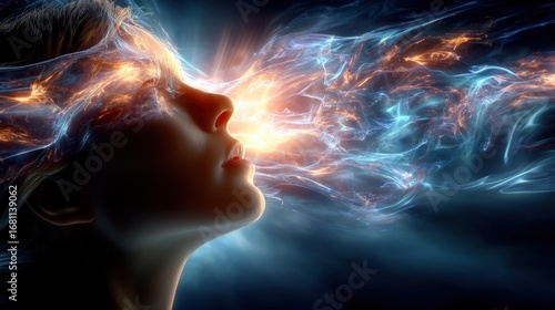 Woman's Head with Abstract Energy Flow: Conceptual Illustration of Inner Power and Imagination