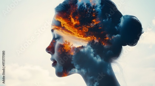 Woman's Profile Silhouetted with a Sunset and Trees Double Exposure