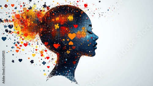 Woman's profile with heart & puzzle pieces dissolving on light background