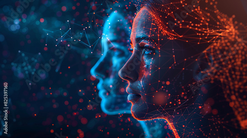 Women digitalized faces in an abstract digital space, close-up with holographic overlays