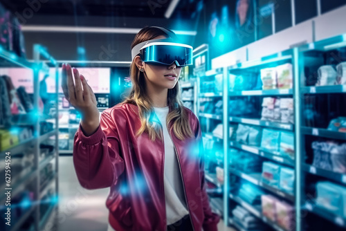Women in shopping mall to use hologram display in the shop , shopping online technology virtual reality in retail combine , Created with Generative Ai