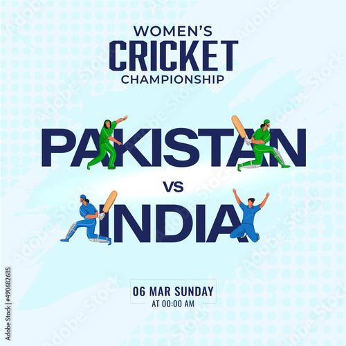 Women's Cricket Match Between Pakistan VS India With Cricketer Players On Light Cyan Dotted Background.