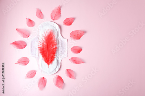 Women's sanitary napkins for the menstrual period with a red feather on a pink background