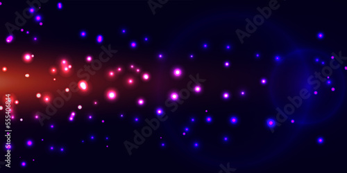 Wonderful abstract background of glitter lights and defocused bokeh. Blinking blue, pink and purple magic sparks, stars on dark background. Neon glow colors. Cosmic backdrop, galaxy