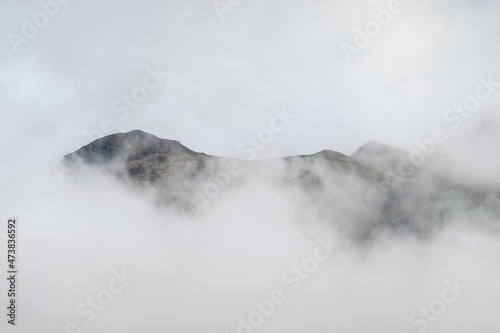 Wonderful minimalist landscape with big snowy mountain peaks above low clouds. Atmospheric minimalism with large snow mountain tops in cloudy sky.