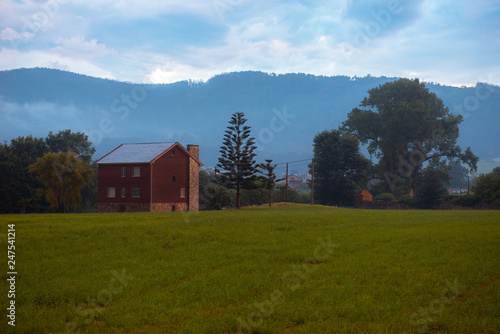 Wonderful view of field with fresh green grass and amazing brick house near spectacular hills on cloudy day in Ribadeo, Spain