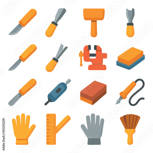 Wood carving tools icons in modern flat vector in minimalistic vibrant color design: carving knife, chisel with wooden handle, mallet, gouge blade, detail knife, V-tool, bench clamp, sharpening