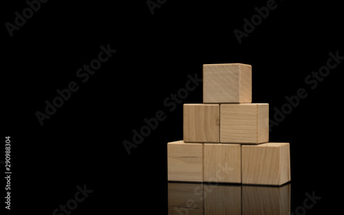 Wood cube arrange in pyramid shape on black background, business concept. Wooden blocks stacked in the shape of a pyramid.