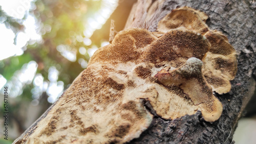 Wood fungus attached to an old tree trunk with optical flair in the background