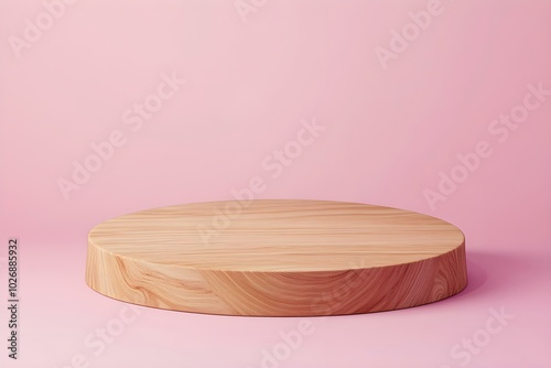 Wood round podium on a pink background. Stand for the presentation of a cosmetics product. 3d empty minimalistic pedestal on a soft background. Template with modern scene for eco design