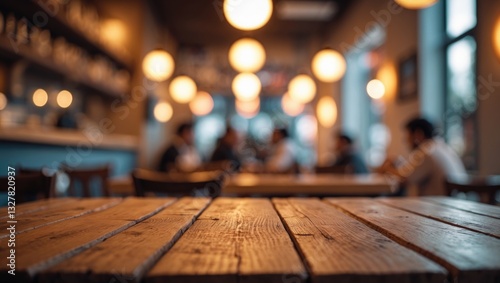 Wood table background, shelf in cafe shop, perspective of wood against a blurred cafe with bokeh lighting, table for product showcasing, empty wooden counter in a blurred white room for mockup, ban...