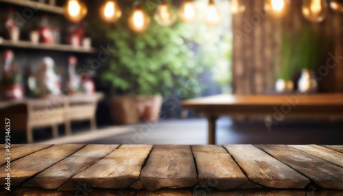 Wood table inside a home with out of focus interior background, with shelves, plants, and hanging lights