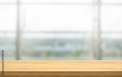 Wood table top on blur window glass, restaurant wall background.For montage product display or design key visual layout
