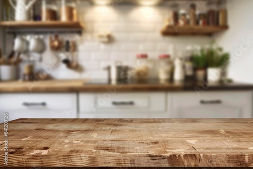 Wood table top on blurred kitchen background. can be used mock up for montage products display or design layout with generative ai