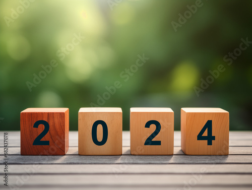 Wooden alphabet blocks spell out 2024 on green blurred background. Happy New Year concept. New beginnings fresh start concept.