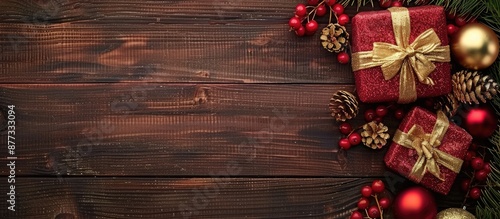 Wooden background with a red glitter gift box shape gold bow pine cone and fruit spray creating a festive display with room for text in the image. Copy space image. Place for adding text and design