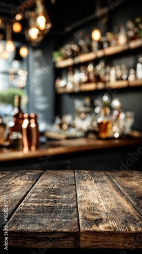 Wooden bar counter, blurred neon cocktail bar in the background mockup for product design and demonstration