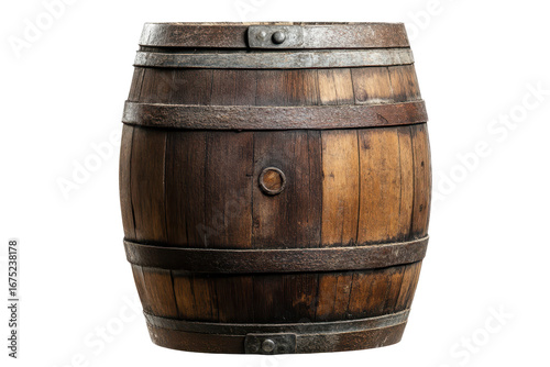 Wooden barrel displayed on a white background highlighting rustic craftsmanship and texture from a crafted wine or beer storage container