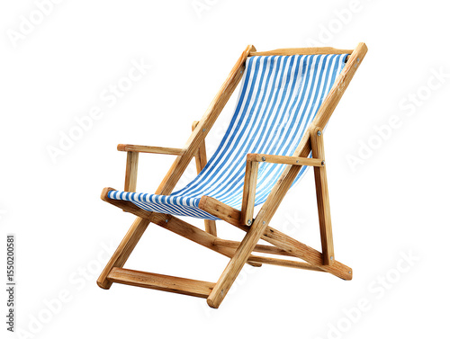 Wooden beach chair with striped fabric on sand, isolated on a clean white background,