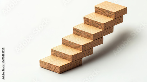 Wooden blocks are stacked in the shape of a staircase on a white background, symbolizing progress or steps to success.