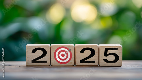 wooden blocks arranged in a horizontal line on a wooden surface. collectively forming the year 2025