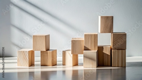 Wooden blocks arranged in an asymmetrical composition against a light background, illuminated by natural light creating dynamic shadows.