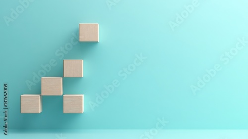 Wooden blocks ascending wall, pastel blue background, growth concept
