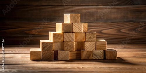 Wooden Blocks Forming a Pyramid on a Rustic Wooden Surface, Representing Growth, Stability, and Achievement