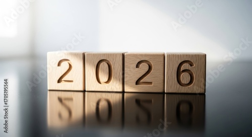 Wooden blocks showing "2026" on a glossy surface with bright light