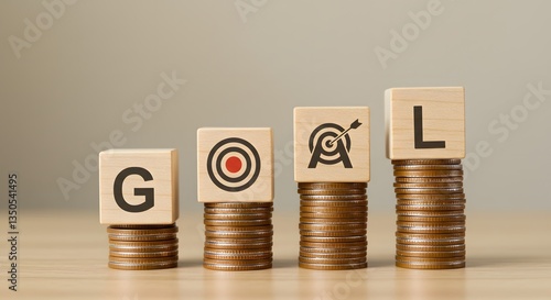 Wooden blocks spelling "GOAL" rest on stacks of coins, with a target icon representing financial planning, savings, Financial Goals and Savings Concept. achieving monetary objectives, business growth,